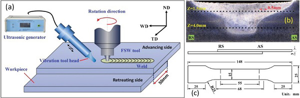 搅拌摩擦搭接焊(FSLW)作为一种固相连接技术,可以用于连接相同或者不同厚度的试板,而且避免了传统熔焊方法中产生的气孔、裂纹和非金属夹杂等缺陷,同时鉴于其在轻合金焊接中的巨大优势,使其在汽车、轮船和航空航天等领域具有广泛的应用前景。在焊接过程中,由于工件材料发生塑性流动使搭接界面发生迁移从而形成钩状缺陷、冷搭接缺陷等界面缺陷,这些界面缺陷的出现会严重影响接头的力学性能。最近,超声振动因其具有能量利用率高、软化效果好等被广泛应用于金属塑性加工过程中,来提高产品生产效率和质量。因此,本文借助超声振动来改善搅拌摩擦搭接焊工艺以及提高接头性能。