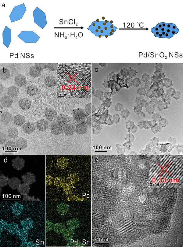 图1. Pd NSs和多级Pd/SnO2 NSs的结构表征