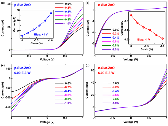 (c)和(d)、不同应变作用下p-n异型和n-n同型异质结光电二极管的光场I-V特性曲线