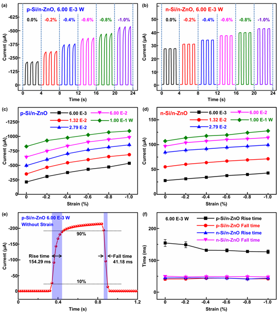 (f)、p-n异型和n-n同型异质结光电二极管的响应时间随应变的变化曲线