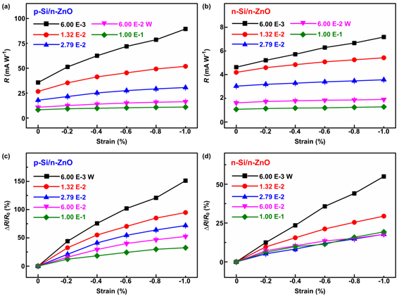 (c)和(d)、不同光强条件下p-n异型和n-n同型异质结光电二极管的光响应度相对变化量随应变的变化曲线