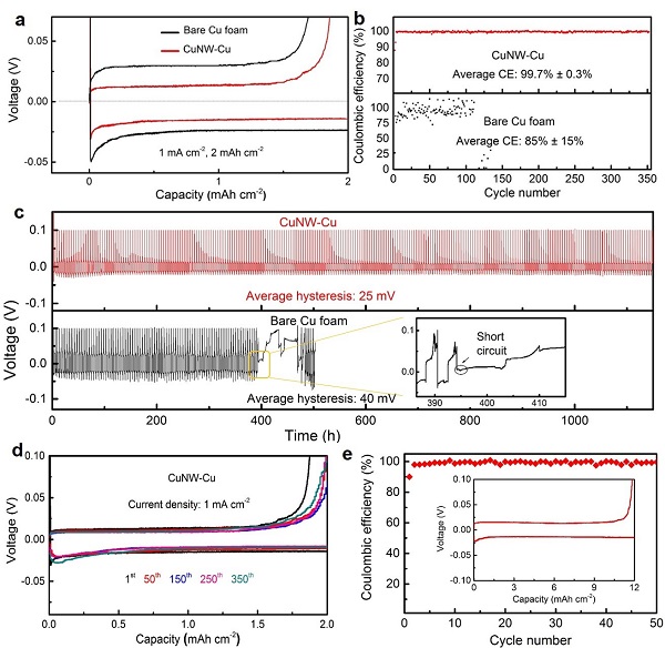 (e)可逆容量为12 mAh cm-2时的循环库伦效率及充放电曲线。