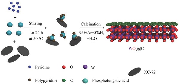 本文通过直接碳化聚吡啶包覆的磷钨酸设计合成了一种新型高效的电解水析氢催化剂(WOx@C/C)。该催化剂在酸性环境中具有优异的电解水析氢活性,并表现出很好的电化学稳定性。氧化钨表面包覆的碳层与其发生了复杂的电荷转移过程,进而有效改善了氢吸附的吉布斯自由能,显著增强了催化剂的电化学析氢性能。实验与理论计算结果表明,该材料具有优异的“类铂”催化特性,具有良好的应用前景。这种碳包覆金属氧化物的设计思路为高性能的非贵金属催化剂的研发提供了一条新的途径。
