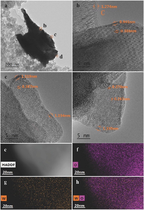 图2 WOx@C/C-2-900的TEM图及EDS图谱