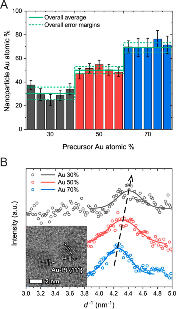 (B)FFT径向强度分布与高斯拟合Au和Pt{111}反射区域的函数图(插图:Au-Pt纳米颗粒的典型HRTEM图像)。