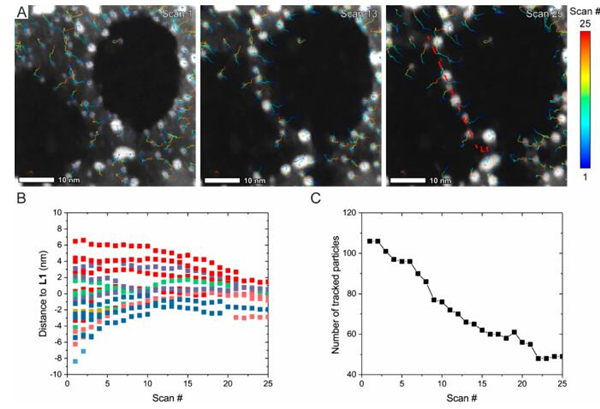 (A)降噪ADF图像和Au-Pt纳米颗粒的追踪图;