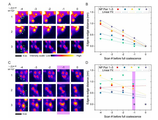 (A,C)序列彩色增强的纳米粒子聚结的降噪ADF图;