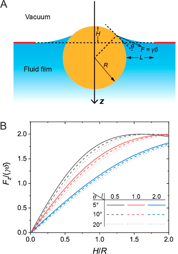(B)z方向上颗粒的毛细管力与流体边缘总颗粒尺寸的相对位置函数图。