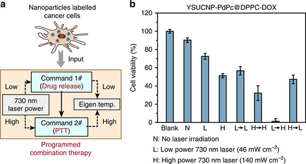 本文报道了一和温度响应的上转换纳米体系,同时包载了化疗药物和光热剂。利用730纳米激光可以诱发上转换纳米复合材料产生光热效应,进而实现热触发的药物释放,而且编程组合治疗效果也在小鼠体内得到验证。总之,该工作发展了一种非侵入的方法来精确调节化疗和光热治疗的联合过程,不仅实现了每种治疗模式的充分利用,还为开发下一代癌症治疗策略提供了研究思路。
