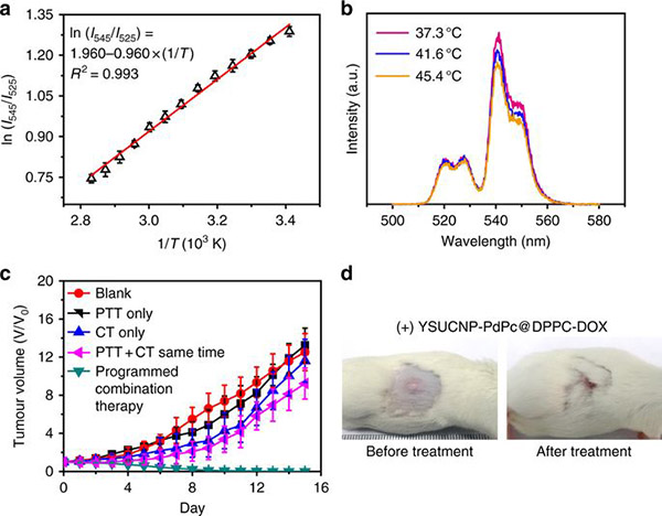近日,复旦大学李富友教授课题组设计了一种温度敏感的上转换纳米复合材料用于化疗-光热治疗组合治疗,并通过监测上转换发光纳米复合材料的微观温度,光热效应可以实现热触发的、先光热治疗后化疗的组合癌症疗法。研究还发现,在化疗药物和热量的保持在相同水平的条件下,组合疗法能够获得更好的治疗效果。该成果以题为”Upconversion nanocomposite for programming combination cancer therapy by precise control of microscopic temperature”发表在Nature Communications上。
