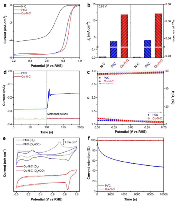 (a)Cu-N-C、N-C和Pt/C催化剂在0.1 M 氧饱和氢氧化钾水溶液的极化曲线
