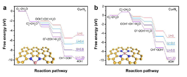 (a)在不同过电位U(V)下,Cu-N2活性位点上发生ORR反应路径的自由能图,插图是Cu-N2的优化结构