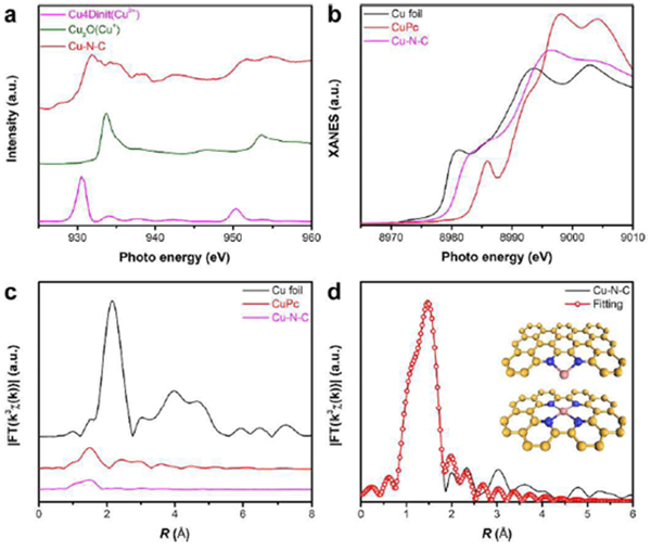 (d)r空间中Cu-N-C对应的EXAFS拟合曲线,插图表示Cu-N-C(Cu-N2和Cu-N4)的模型示意图