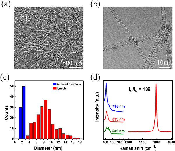 (c) 从TEM图像测量的SWCNT膜的直径分布,呈现出高比例的孤立纳米管和小束;