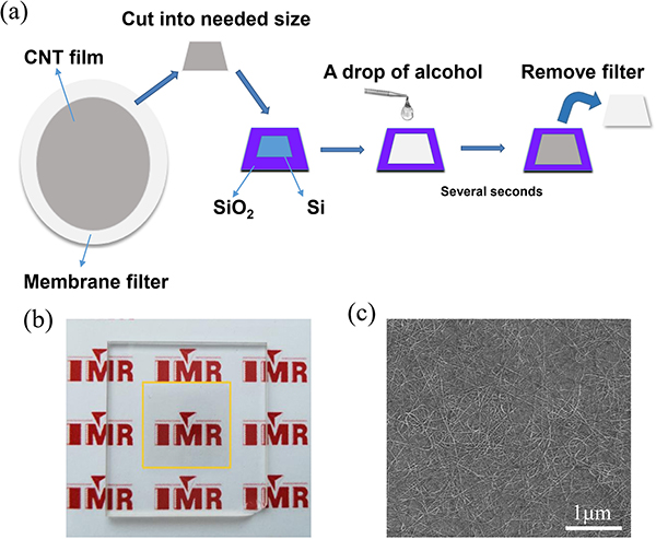 (b) 转移到石英衬底上的SWCNT膜的光学图像;
