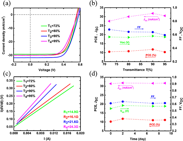 (b) 随光透度变化的太阳能电池的PCE,VOC,FF和JSC值;