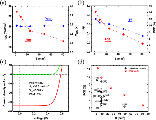 (a) SWCNT/Si太阳能电池的Voc,Jsc与器件有效面积的函数关系图;