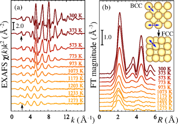 (a)300到1273 K的温度区间中的k空间实验Fe K-edge EXAFS,图中箭头表示在低k范围内的特征,其变化意味着从bcc到fcc结构发生的相变(如图b插图所示)