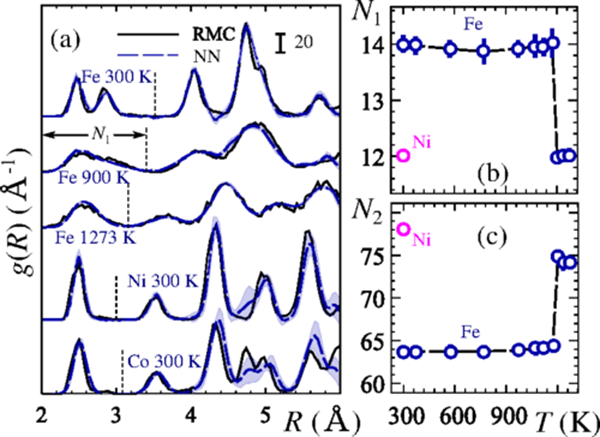 (a)铁在300、900和1273 K及镍(fcc)、钴(hcp)在300 K时的RDFs,其由神经网络从实验EXAFS中获得。虚线表示10个独立训练的神经网络的平均结果,阴影区域表示这些结果的标准偏差以及表征时所存在的不确定性