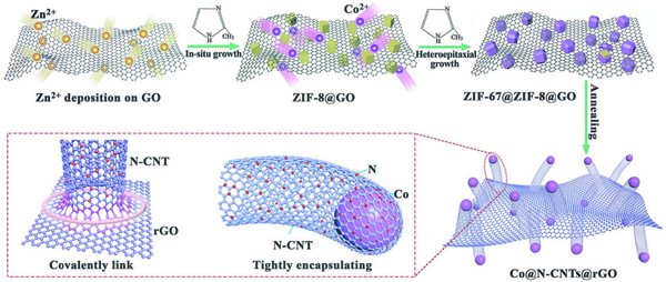 近日,在上海复旦大学吴仁兵教授、孙大林教授和方方教授(共同通讯作者)团队的带领下,与上海材料创新研究院、中科院物理研究所和美国劳伦斯伯克利国家实验室合作,开发了一种新型有效的方法,通过直接退火氧化石墨烯(GO)的方法,合成了接枝在还原氧化石墨烯(rGO)(Co@N-CNTs@rGO)两侧的N掺杂碳纳米管(N-CNTs)包裹的核-壳双金属沸石咪唑酯骨架。独特的核-壳ZIF-67@ZIF-8有助于通过原位形成非常薄的N-CNT包裹超细Co纳米颗粒,而GO可以作为基质来松弛CNT并确保足够的空间为了它们的生长,避免高温下的颗粒和碳聚集。此外,通过ZIF-67@ZIF-8覆盖GO被认为暴露更多的催化位点。所制备的Co@N-CNTs@rGO复合材料表现出优异的氢析反应电催化活性,其复合材料在达到10mAcm-2时,在1MKOH和0.5MH2SO4中分别只有108和87mV的过电位,分别比在大pH范围内报道的大多数钴基电催化剂好得多。更重要的是,所开发的策略是可控的和多功能的,并且可以容易地扩展以制备具有优异电催化性能的二元和三元过渡金属合金@N-CNTs@rGO杂化物。相关成果以题为“Ultrafine Co Nano particles Encapsulated in Carbon–Nanotubes–Grafted Graphene Sheets as Advanced Electrocatalysts for the Hydrogen Evolution Reaction”发表在了Adv.Mater.上。