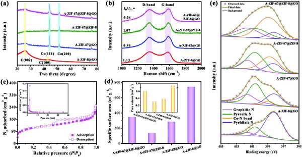 (d)为A-ZIF-67@ZIF-8@GO,A-ZIF-67@ZIF-8,A-ZIF-67@GO和A-ZIF-8@GO复合材料的比表面积,插图是A-ZIF-67@ZIF-8@GO,A-ZIF-67@ZIF-8,A-ZIF-67@GO和A-ZIF-8@GO复合材料的孔径分布;