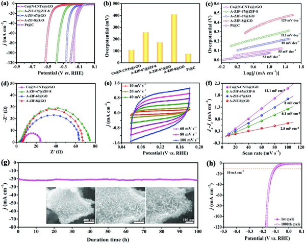 (a-f)为Co@N-CNTs@rGO,A-ZIF-8@GO,A-ZIF-67@GO和A-ZIF-67@ZIF-8电极的LSV曲线(a),在10mAcm-2的电流密度时的过电位(b),中塔菲尔斜率(c),EIS光谱(d),Cdl值(f);