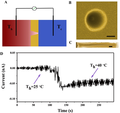 图1.仿皮肤的LGH收集系统实验装置和热电行为。A)仿生热电转换装置示意图。具有锥形仿生纳米通道的PI聚合物膜用于分离具有不同温度的溶液,其中纳米通道的小口端一侧是高温(Th)溶液。 B,C)仿生纳米通道的扫描电子显微照片顶视图和横截面视图。比例尺,200纳米。 D)快速测试热电现象Th(40 ℃)> Tc(25 ℃),观察到明显的动作电流。
