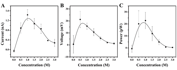 图2. A)电流,B)电压和C)输出功率与电解质浓度关系,实验条件:Th = 65 ℃,Tc = 25 ℃,和dtip = 11.27 nm。 他们峰值的位置在≈1 M。 除非另有说明,实验中使用的电解质浓度为1 M。