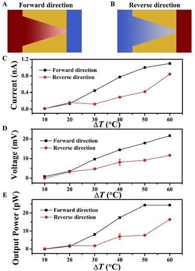 图3. 基于BSN的系统的热电特性。A,B)正向和反向示意图说明。C)电流,D)电压,以及E)输出功率与温度梯度在正向和反向情况下的关系。实验条件:Tc = 25 ℃,dtip = 11.27 nm,C =1 M。