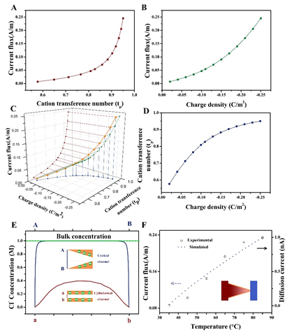 图4. 基于BSN的热电转换系统的理论模拟。A-C)扩散电流,阳离子转移数量,和表面电荷密度之间的关系。 D)扩散电流与阳离子转移和电荷密度函数的三维示意图。 E)锥形通道和圆柱形通道在高温热液的一侧Cl– 浓度的比较。 不对称通道有助于抑制浓度极化。 F),该仿生热电转换体系的电流与温度梯度的在理论和实验中关系比较。