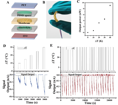 总之, 受人体皮肤启发,我们构筑了基于BSN的热电转换系统,实验和理论结果表明,该体系可用于收集废热,在温度梯度(ΔT)为40 ℃时,其功率密度可达88.8 Wm-2。该设计思想为理解生物系统中的温度感测过程提供帮助。