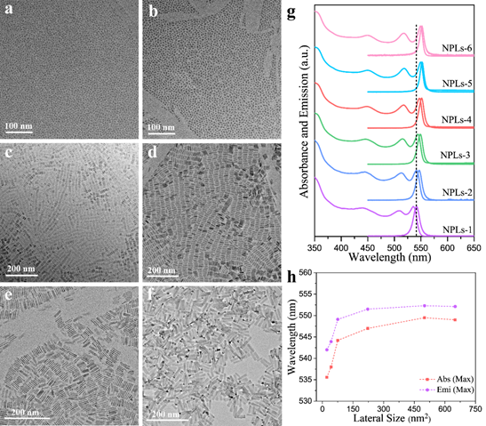 (g)不同尺寸的CdSe纳米片的吸收和发射光谱图