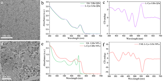 (a-c)CdSe量子点的TEM图,配体交换前后的吸收光谱图,及CD光谱图