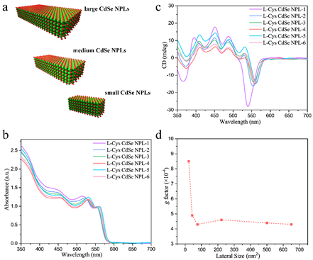 (c)不同横向尺寸CdSe纳米片的CD光谱图