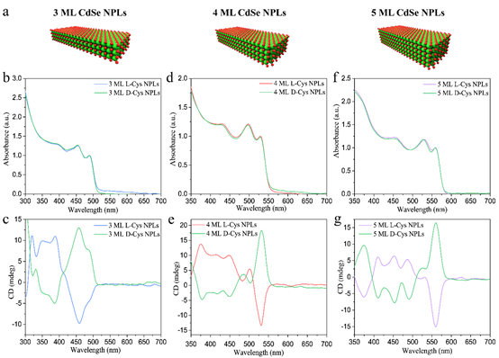(f, g)5层D-手性和L-手性的CdSe纳米片的吸收光谱和CD光谱