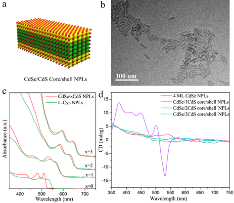 (d)不同壳层的CdSe/CdS核壳纳米片CD光谱图