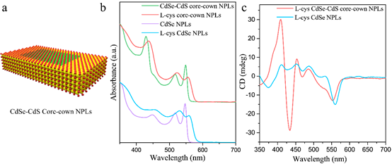 (b, c)3层D-手性和L-手性的CdSe纳米片的吸收光谱和CD光谱