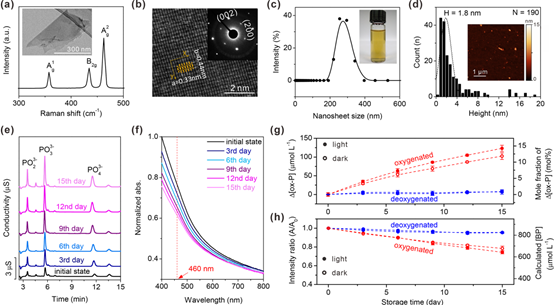 (c)黑磷纳米片的尺寸分布及悬浮液