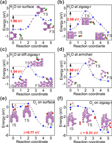 (e)和(f) 氧分子分别在黑磷表面及重构的zigzag边界上解离的最小能量路径