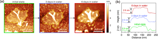(a)和(b) 含氧水中黑磷纳米片随时间的形貌及厚度变化