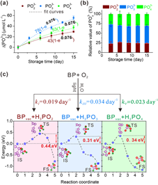 在该项工作中,研究者实时监测黑磷在水中的降解产物(PO23-,PO33-和PO43-)浓度和黑磷结构在不同环境下的变化过程,明确了氧作为黑磷分解的核心条件,而光照仅仅起到加速作用,发现黑磷的分解速率与层数无关,进而明确了黑磷在水中分解的准一级平行反应动力学特征。在此基础上发现黑磷在除氧的水中,即使在光照条件下,保存15天后仅仅分解0.9 mol%。