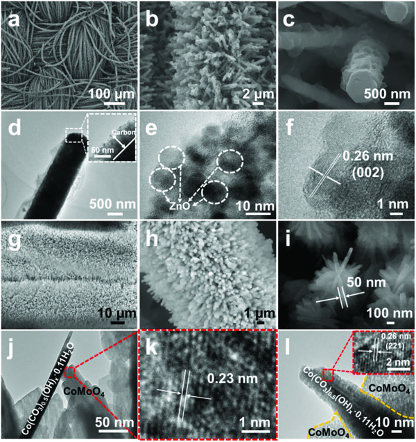 j-l)分支状CC-CCH@CMO的TEM和HRTEM图像,其中(l)中的插图表示选定区域的HRTEM图像。