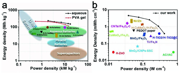 b)基于整个柔性电池体积的全固态纤维状Zn-Co电池的Ragone图。