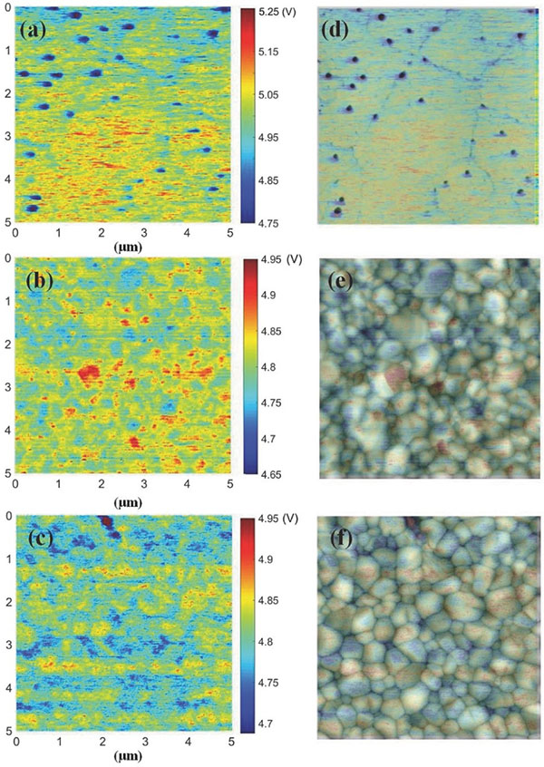(b, e): PEAI掺杂的钙钛矿(PEAI/PbI2=0.05)薄膜的表面电位和相应的形貌图;