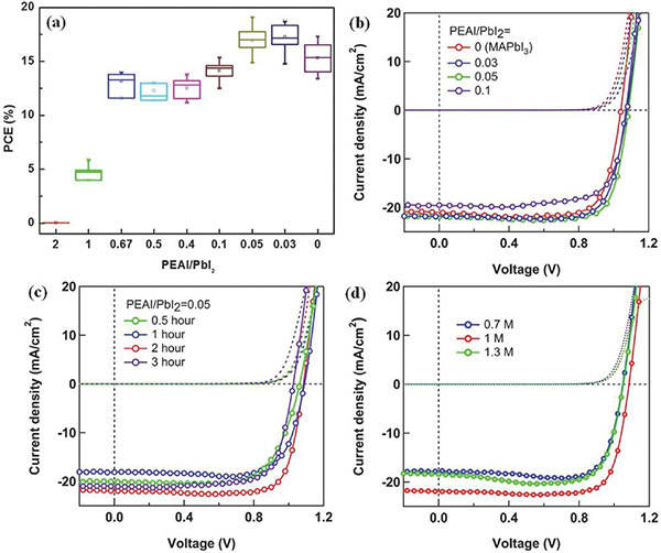 (d): 不同PEAI掺杂PbI2(PEAI/PbI2=0.05)浓度与MAI蒸汽反应2 h的器件的J-V曲线。