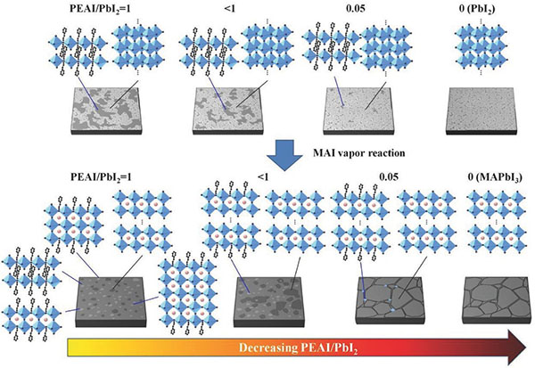 近日,中国台湾国立成功大学陈昭宇教授和郭宗枋教授(共同通讯作者)团队首次采用低压蒸气辅助溶液加工法制备了2D/3D有机金属卤素钙钛矿。具体方法为将苯基乙基碘化铵(PEAI)掺杂的碘化铅(PbI2)基底与放置在低压加热炉里的甲基碘化铵(MAI)蒸气反应。扫描电子显微镜图像和开尔文探针力显微镜图谱表明含PEAI的2D钙钛矿大晶粒围绕在3D MAPbI3钙钛矿晶粒周围,有利于MAPbI3晶粒生长。PEAI的掺杂比例对晶体结构、表面形貌、晶粒尺寸、紫外-可见吸收和光致发光光谱以及器件性能有着重要的影响。当PEAI/PbI2 = 0.05时,2D/3D有机金属卤素钙钛矿器件光电转换效率最高为19.10%,填充因子高达80.36%,器件稳定性也得到改善。相关研究成果以 “Highly Efficient 2D/3D Hybrid Perovskite Solar Cells via Low-Pressure Vapor-Assisted Solution Process” 为题发表在Adv. Mater.上。