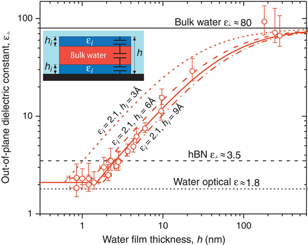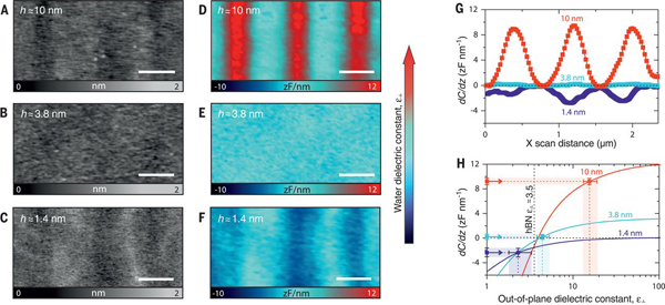 今日,在英国曼彻斯特大学 A. K. Geim教授和L. Fumagalli教授(共同通讯作者)的带领下,与伊朗沙力夫理工大学,西班牙巴塞罗那大学和日本国立材料研究所合作,使用了可以用水控制填充的不同高度的狭缝状通道。这些通道被结合到电容电路中,对介电性质的局部变化具有极高的灵敏度,能够确定在内部的水的面外介电常数ε⊥。通过先前报道的方法:三个原子扁平的石墨和六方氮化硼晶体(hBN)的范德瓦尔斯组装来制造实验器件。石墨被用作组件的底层以及电容测量中的接地电极。接下来,将间隔层放置在石墨的顶部,将hBN晶体图案化成平行条纹。通过将另一个hBN晶体放置在顶部来完成该组装。隔离物确定了通道的高度h,另外两个晶体用作顶部和底部的壁。每个设备对于给定的h都包含多个并行通道,这确保了测量的高重现性并减少了统计错误。当需要时,通道可以通过从背面用石墨蚀刻的微米尺寸的入口用水填充。揭示了具有极小极化的界面层的存在,使得它的面外ε仅为〜2。发现电死层为二到三分子厚。这些结果为描述水介导的表面相互作用和界面水行为的理论提供了思路,并展示了一种方法来研究在极限条件下的其他流体和固体的介电性质。相关成果以题为“Anomalously low dielectric constant of confined water”发表在了Science上。