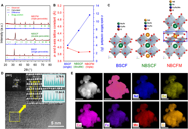 近日,在韩国世宗大学Jun-Young Park教授和蔚山国立HTH官网地址 研究所Sang Hoon Joo教授的带领下,与成均馆大学,浦项加速器实验室和韩国科学技术研究院全北分校合作,报道了一种基于三重钙钛矿Nd1.5Ba1.5CoFeMnO9-δ的高性能氧电催化剂(NBCFM)。三钙钛矿被定义为立方钙钛矿结构,其中一个立方轴(c轴)增加了三倍,NBCFM结构可以通过堆积三个单一钙钛矿块与中心Nd3+和顶/底部Ba2+在A位点。该催化剂显示出氧电极反应对单钙钛矿和双钙钛矿具有优异的活性和耐久性。当与氮掺杂还原氧化石墨烯(N-rGO)杂化时,所得NBCFM/N-rGO催化剂显示出进一步提高的双功能氧电极活性(0.698V),其超过Pt/C(0.801V)和Ir/C(0.769V)催化剂,并且其在钙钛矿电催化剂中是迄今报道的最佳活性。综合表征表明,NBCFM的优良催化性能可能与其富氧缺陷结构,较低的电荷转移电阻以及O 2p和Co 3d轨道之间杂化强度较小有关。相关成果以题为“Oxygen-deficient triple perovskites as highly active and durable bifunctional electrocatalysts for oxygen electrode reactions”发表在Science Advances上。