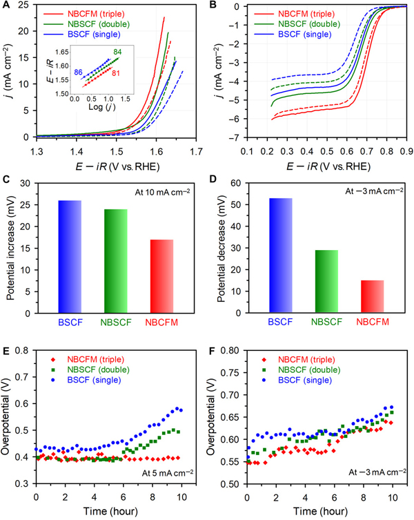 (D)BSCF,NBSCF和NBCFM 循环后在-3 mA cm-2时ORR的电位降低;