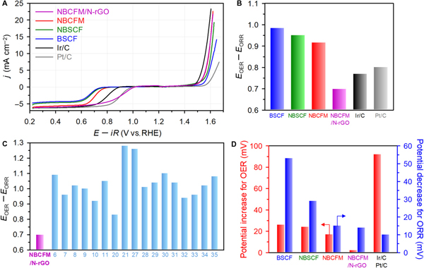 图3.钙钛矿,NBCFM/N-rGO和贵金属催化剂的双功能氧电极活性和耐久性